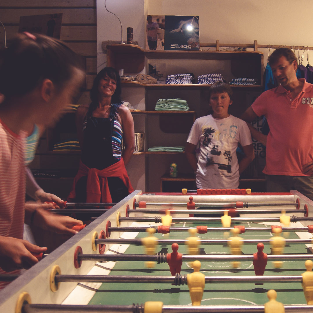 - Bureau de l'école de surf avec WIFI gratuit, location de SUP, baby-foot, skateboard, planches indo, vélos de plage, DVD de surf et bien d'autres choses encore.